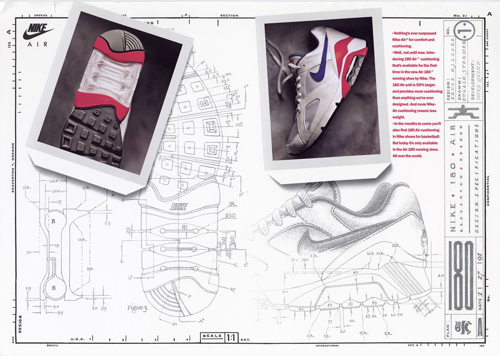 An underrated classic. In spring 1991, the Nike Air Max 180 was released. This revolutionary shoe contained 50% more air than previous Air Max models. Nike went one step further by displaying this technology through a visible protective outsole. The Air 180 was only around for a year, even though Nike supported its launch with a huge TV advertising campaign involving high-profile filmmakers and directors.