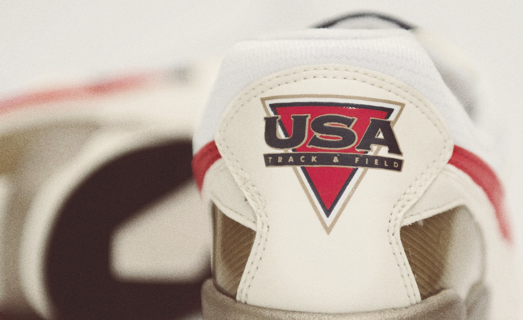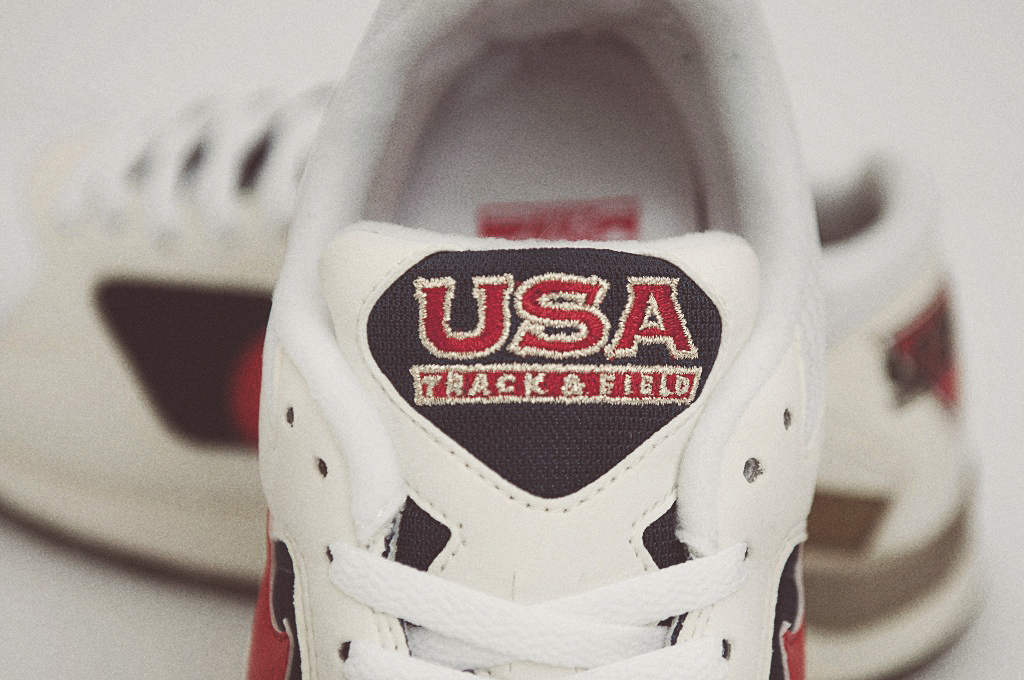 The bold shape is predominately white mesh and micro-suede with a plethora of red and blue accents throughout, with a complimentary gold paneling around the heel and sole hinting to the Gold Medals won by both the Track & Field athletes and famed ‘Dream Team’. To complete the Olympics-themed model, USA lettering is featured in gold trim on the heel and padded tongue.