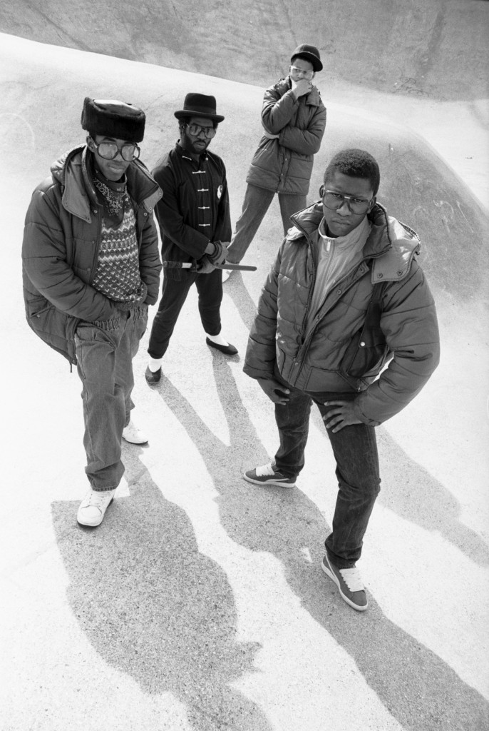Hip-hop artists Hijack in the bowl of Stockwell skate park, South London, 1987 © Normski