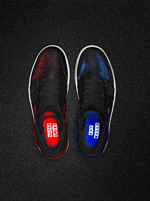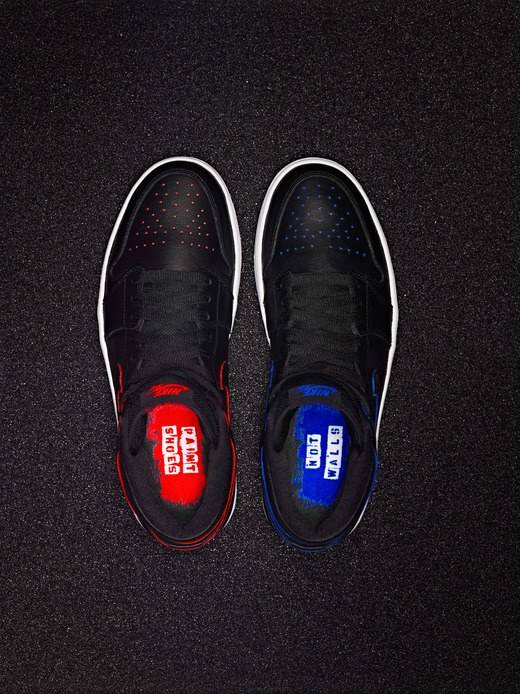 More literal with his designs, Mountain chose to emphasize how skaters of the era mismatched pairs in order to extend the life of their Jordan’s. To create uniformity they would then paint over each shoe. The two Lance Mountain Nike SB x AJIs recreate this aesthetic by mismatching both a black/red and black/royal colourway in one pair and then covering the colours, DIY-style, with black or white paint. As each pair is worn and the paint wears away to reveal the colours underneath, they will become unique to their wearer. To finish Mountain created a “Paint shoes not walls” graphic that emblazons his attitude on the insoles. The Nike SB x Air Jordan 1 designed by Lance Mountain launches on Saturday 7th June.