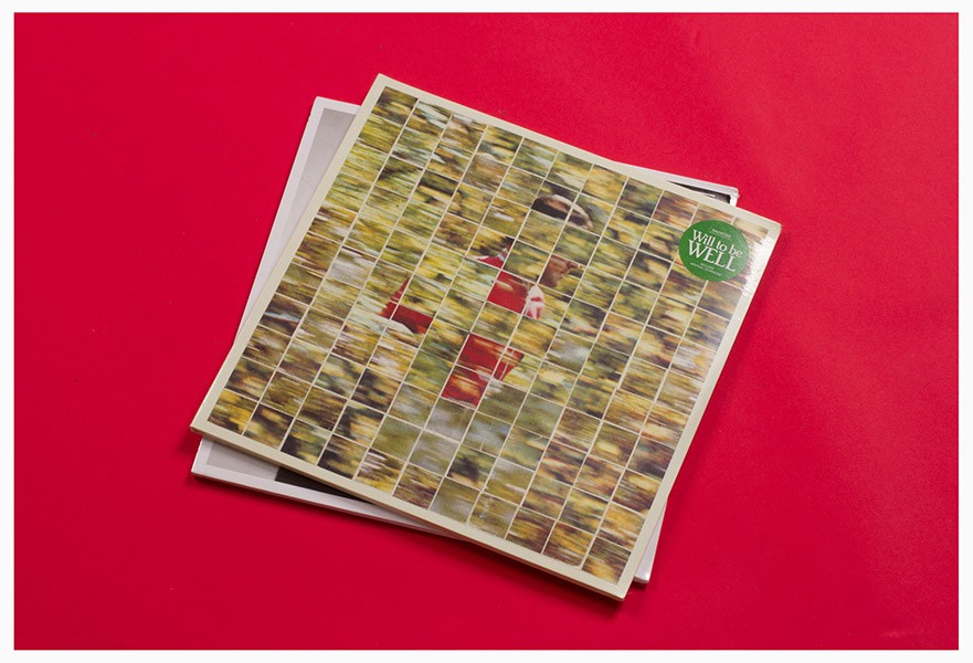 For our first Question Mark in the ongoing series, he’s made use of his collage method to build up a bold, solid red background foundation, accented by the torn edges made when the paper is physically separated. What appears to be colourised, vintage style portrait has it’s identity censored by the overlaid, punctuation filed speech bubble.