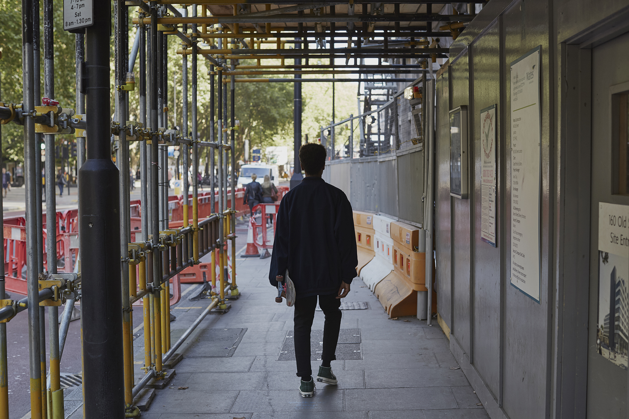 From the studio, we head towards Dalston via Shoreditch, just enough time to skate between locations. Tre’ – an advocate for mental health awareness in young men – cites music production and skateboarding as creative outlets that keep him occupied, centered and focused. From Shoreditch, we head to ‘Peppers & Spice’ of Dalston, a Caribbean café Tre’bore regularly frequents. Food in hand, we head over to another skate spot and regular hang-out of Tre’s – Gillette Square to eat.