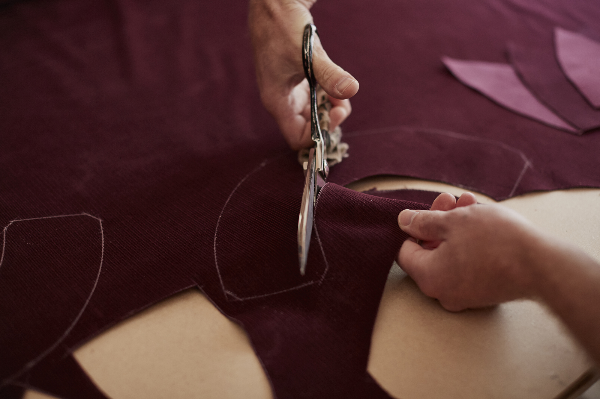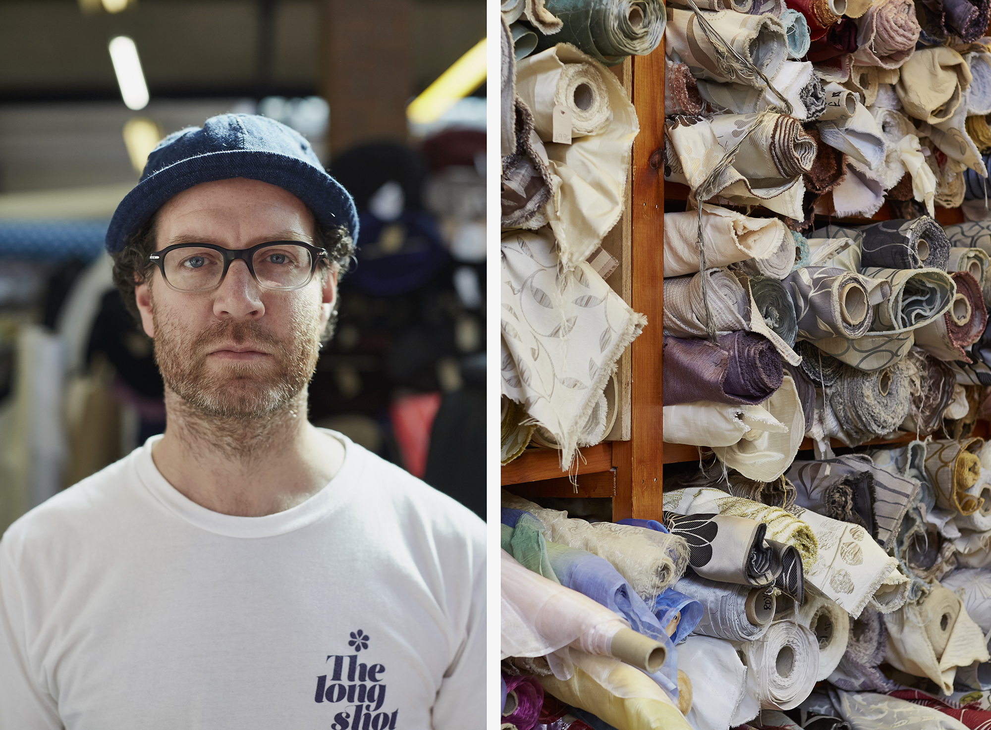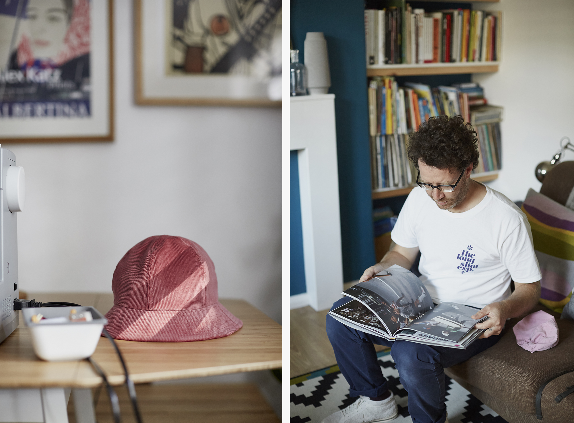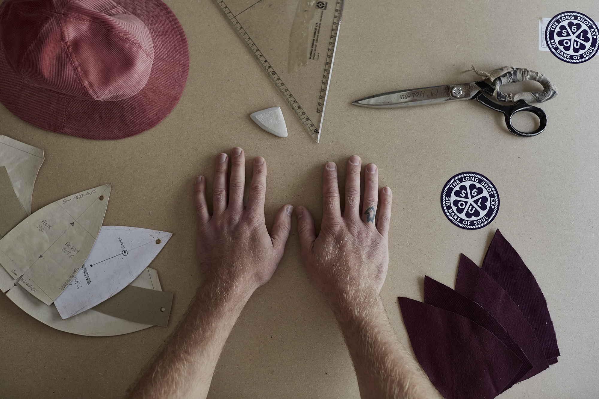 At the end of our encounter we pick up an array of fabrics and head back to the studio to start the design process. Mike sets about preparing some client orders. Brisbane moss corduroy fabric being used to create a military style ball-shaped bucket hat; created using his Singer sewing machine. As Mike cuts away at his roll of fabric we talk about his previous brand ‘Militia’ – which boasted seminal London store ‘Bond’ as a stockist – and his transition from apparel to headwear and plans for The Long Shot Experiment.