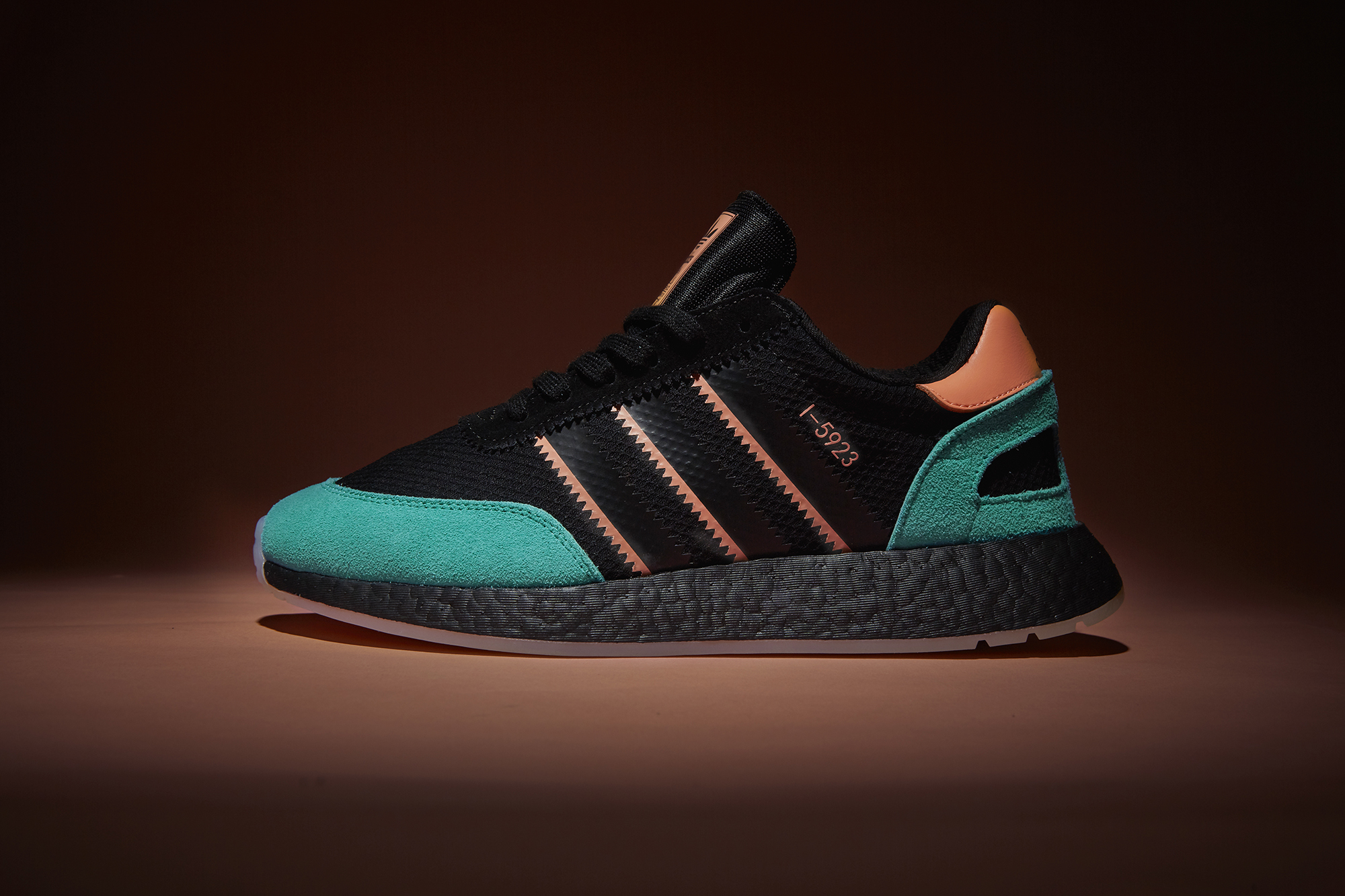 The latest size? Exclusive I-5923 iteration features vibrant teal suede panels on top of a black mesh upper. Peach details sit along the iconic three stripes, and the seldom seen black boost midsole is finished off with a semi-transparent outsole.