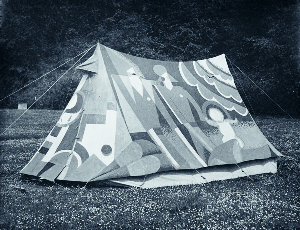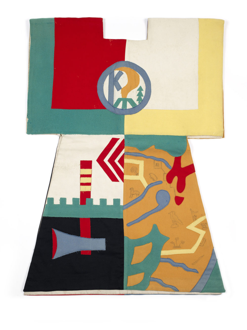 Kibbo Kift’s social and spiritual ambitions were communicated through a wide range of visual media, mostly handcrafted by members. From appliqued flags to painted tents, the group’s colourful aesthetic combined worldwide spiritual influences with English folklore. Images of Beowulf and Robin Hood suggested a yearning for a lost past, but these nestled alongside stylised representations of machines and modernist architecture. Kibbo Kift aimed to return to cultural origins in order to design a new future; this resulted in a caveman-meets-robot chic.