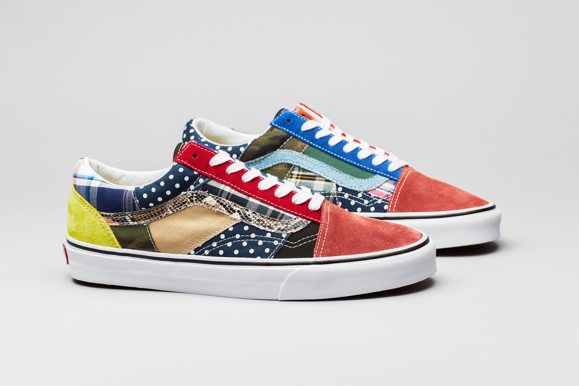 Thematically, the release relates back to the first Vans Anaheim factory in California, the original location where the brands shoe were made in the USA. The hap-hazard mash up of materials pays homage to the excess off-cuts found on the floor of the workshop after the panels of a regular shoe have been spliced and taken away to construct one solid shoe.