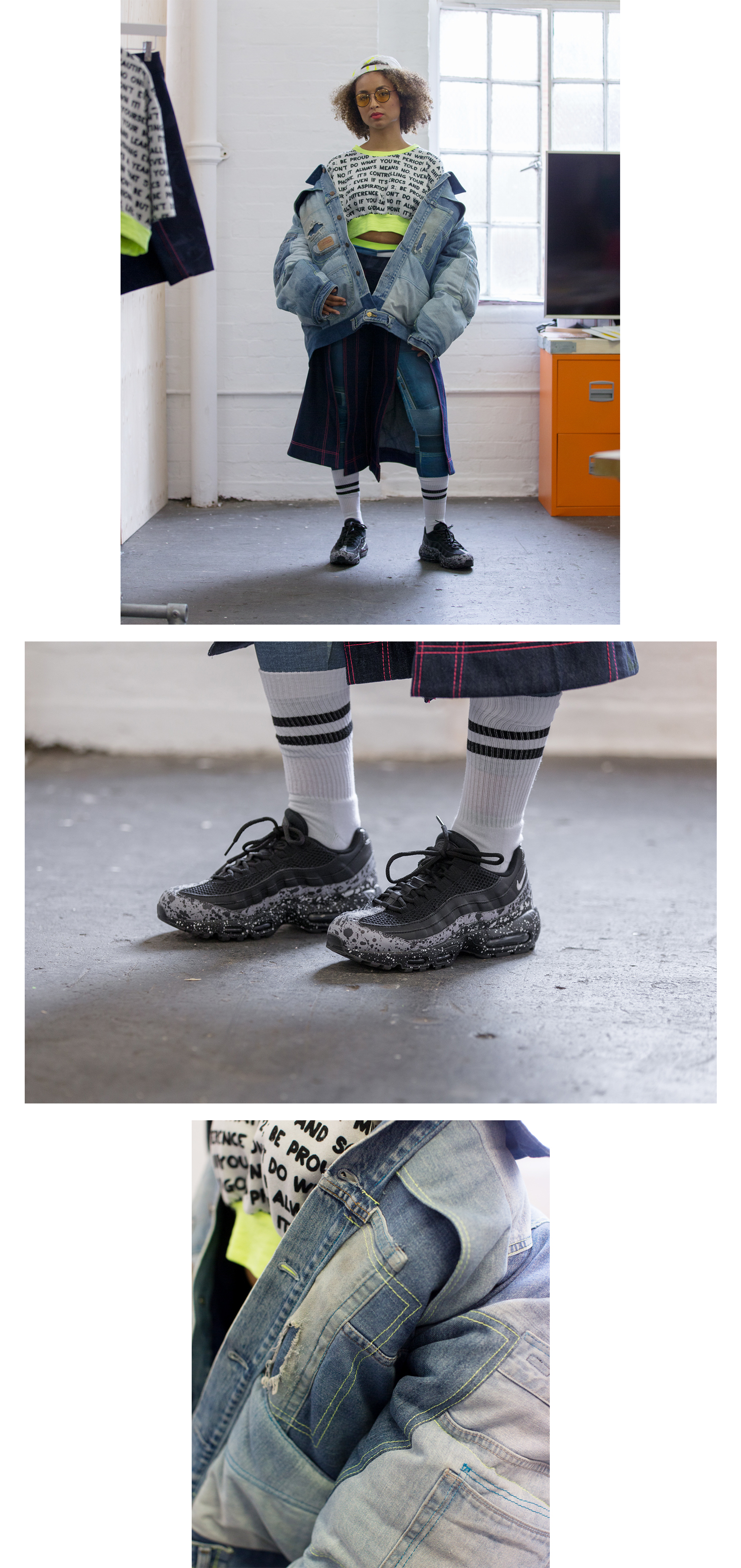 Emily selected the Nike Air Max 95 and Air Max 97 Terrazzo to feature alongside her collection due to it’s similar aesthetic that tied into each piece seamlessly, with both the colour scheme and style of graphic aligning with her chosen direction.