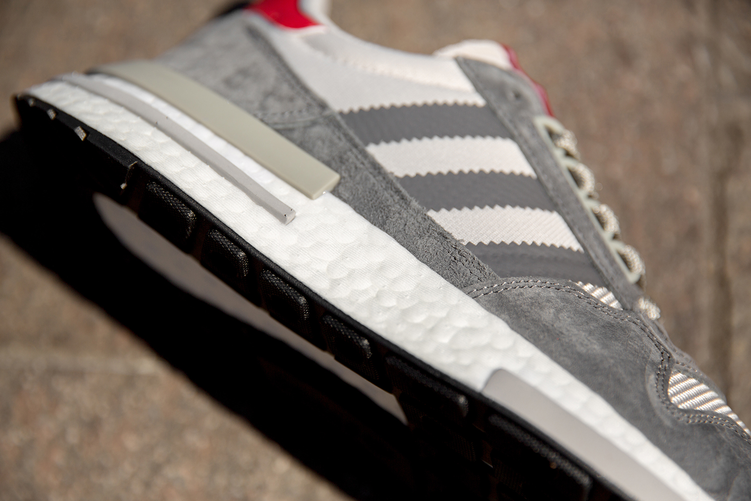 Arriving in two colourways, the first is an homage to the original Grey, White and Red ZX500 from years gone by. The second (Keep an eye out for images tomorrow) is a more contemporary take that uses a deep stone grey as a base colour, with candy floss pink accents found on the tongue branding and midsole inserts.
