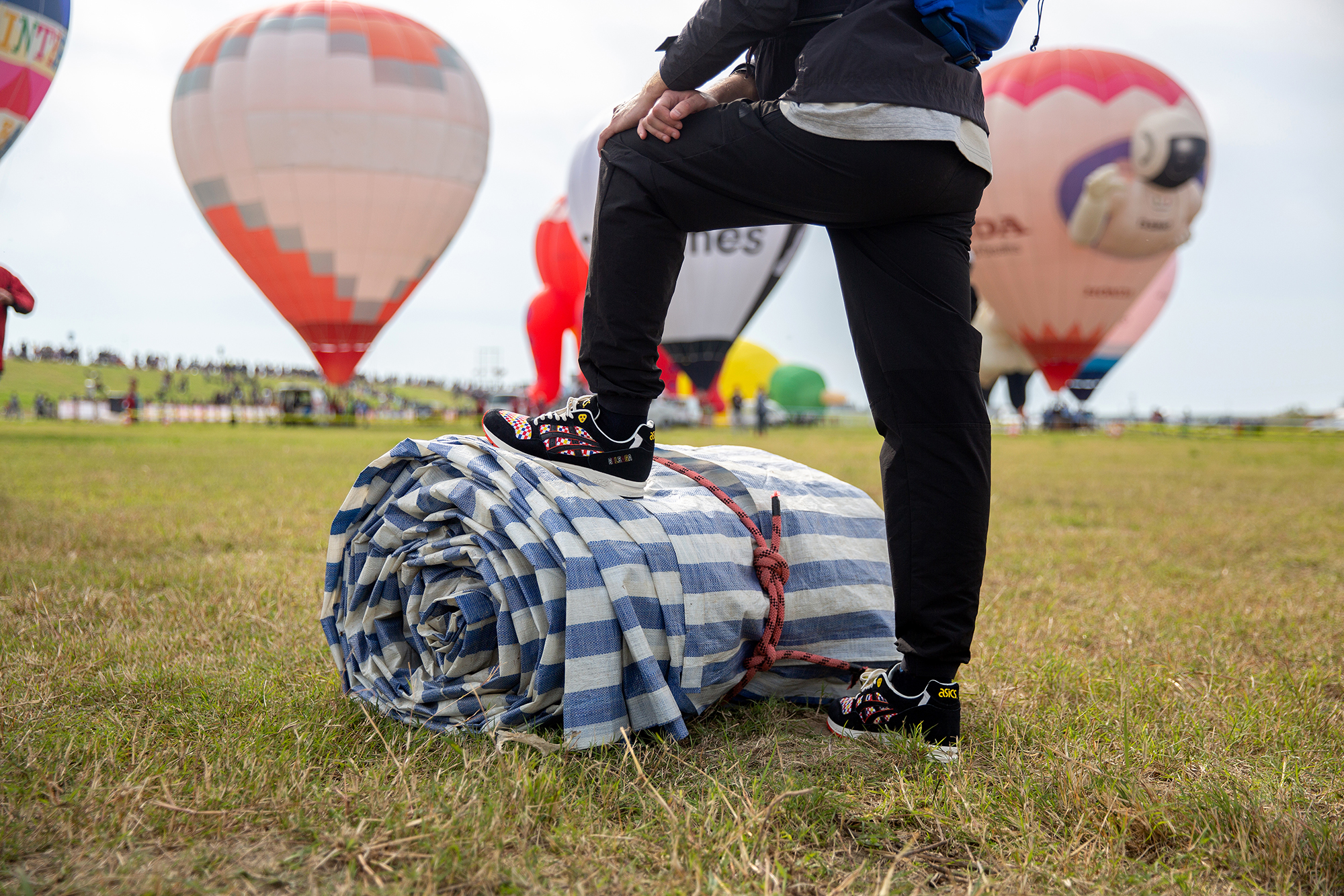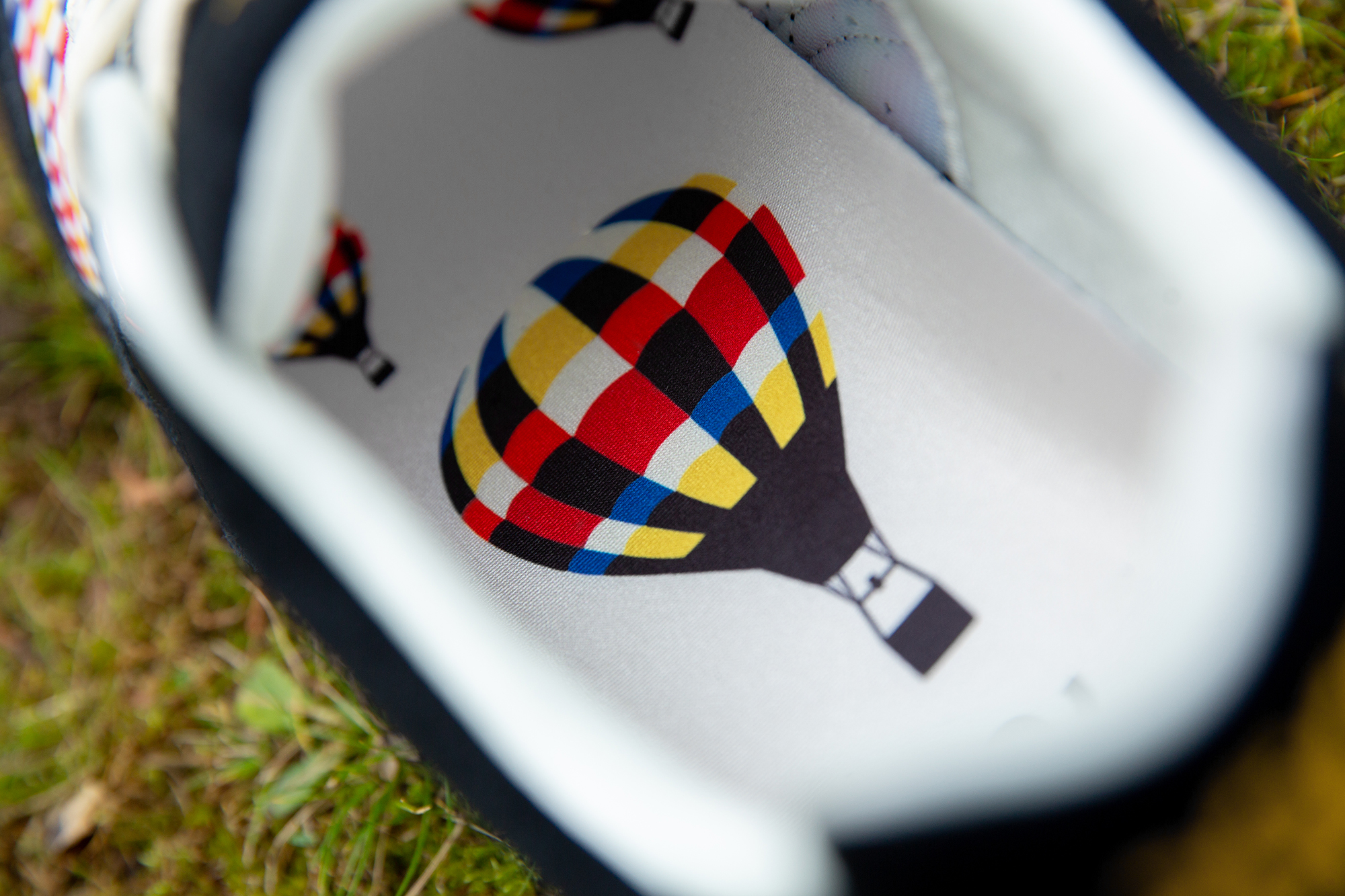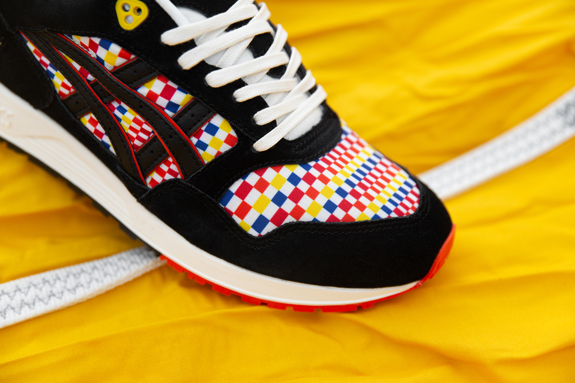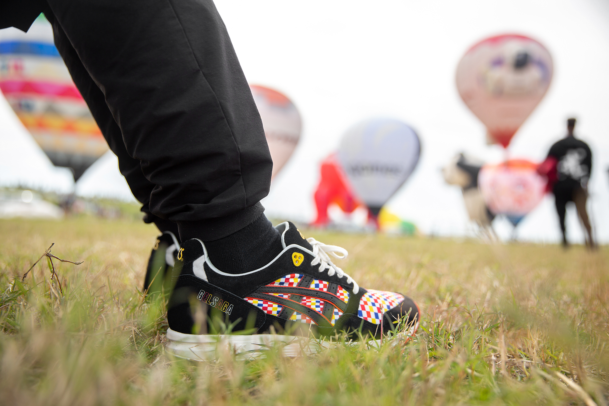 Paying homage to the traditional event, we’ve applied a themed colourway and material make-up onto the original shape of the GELSAGA. A multi-coloured ripstop reminiscent of that used on a Hot Air Balloon’s Envelope sets the theme in motion, sitting on the toebox and sidewall underlay. Deep black suede covers the upper, a material inspired by the gloves worn by pilots to avoid the scorching heat of the Burners. Finishing off the detailing, alternating coloured lettering is placed on the heel counter calling out the silhouette’s name, and a multi-Balloon print graphic sits on the inside sockliner.