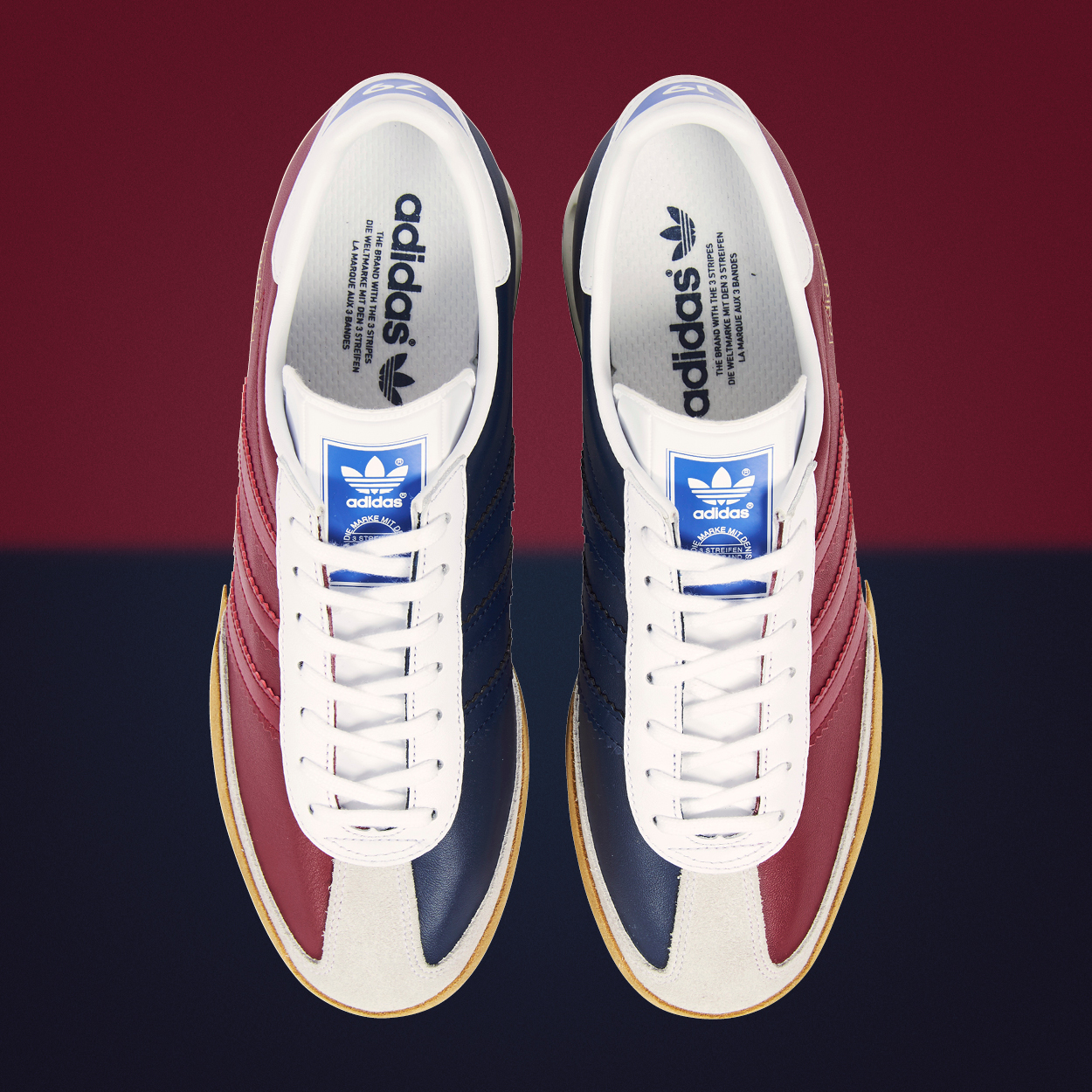 Shades of navy blue and maroon red split down the centre of the premium leather uppers, taking inspiration from the classic Americana ten-pin bowling shoes of the 1960s. The bowling shoe became a fashion essential in the 60s when kids, too young to hang in the pubs, came to the bowling alleys with scuffed up plimsoles and left wearing brand new bowling shoes. It soon became a trend that resonated with “Mods” from the era.