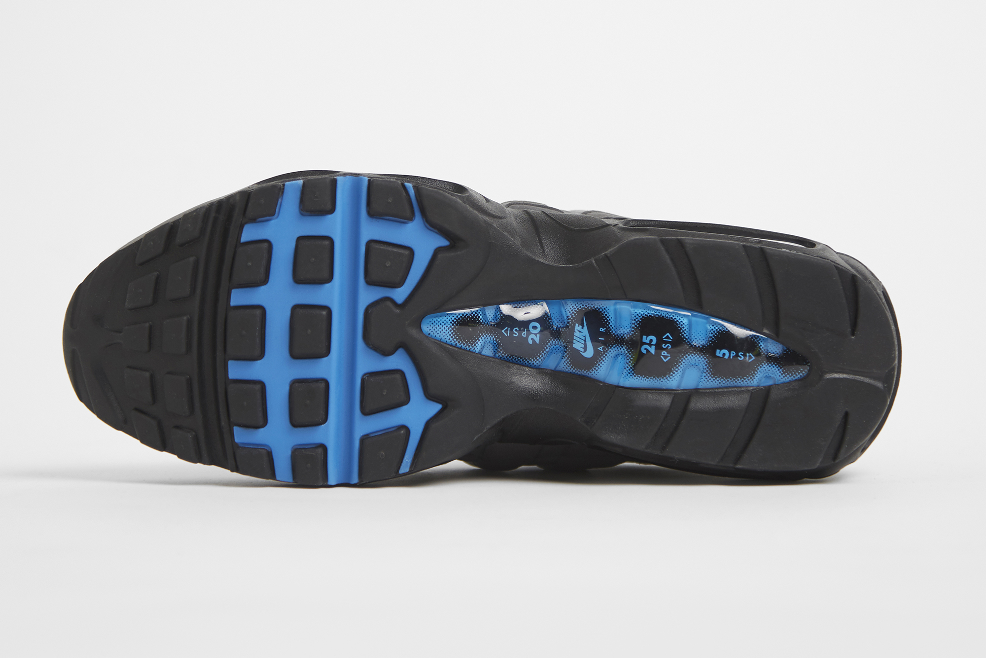 Fast-forward to 2018 and the Air Max 95 is making a return dressed in it’s original ‘Crystal Blue’ colourway. The layered upper takes on the white to black gradient which merges seamlessly into the black midsole. Underfoot the Air unit takes on the ‘Crystal Blue’ tone, alongside the nylon eyelets and signature mini Swoosh on the heel. A nice original touch on these latest reissues has been the addition of PSI measurements on the soleplate, and this is also the first time arch supports have been included in a release.