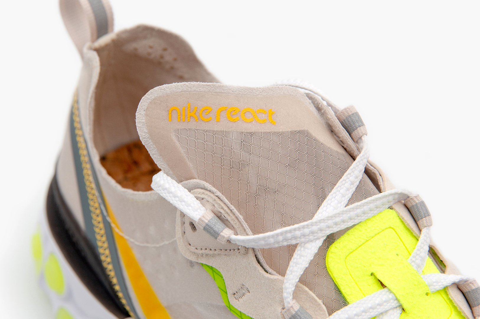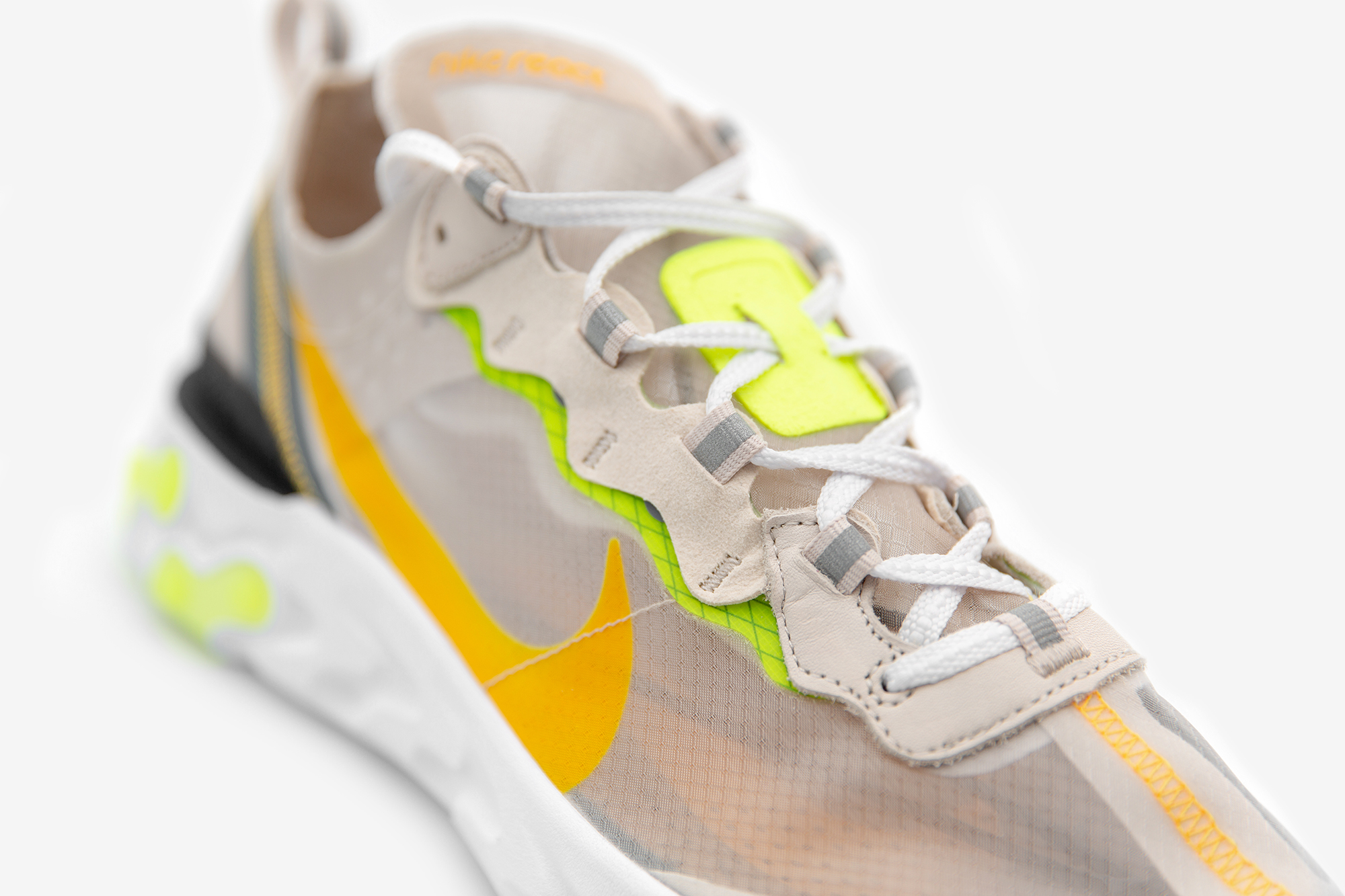Designed by Nate Jobe and the Nike special projects team, who’ve created a technical, futuristic runner built upon the sensibilities outlined in the performance products. Advanced in its construction, the React Element 87 features responsive REACT foam cushioning and an inside-out “deconstructed” aesthetic. The inspiration for the style came from drilling holes in the foam of the sole unit, with the aim of attaining greater levels of comfort while standing, walking, shifting and sprinting. These trials allowed designers to determine which hole depth and densities accomplished their comfort goals. The team then applied the abstract outsole to a retro Internationalist-inspired upper, which was constructed from 100% TPE textile yarn, that would complete the React Elements’ translucent look, in-turn creating a truly modern silhouette.