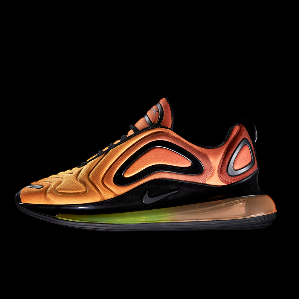The latest editions take their inspiration from a selection of Earth’s natural phenomena. These ‘Total Eclipse, ‘Sunset’, ‘Pink Sea’, ‘Green Carbon’ and ‘Triple Black’ iterations are wrapped in sleek gradient colourways and soft, breathable mesh, while “720” branding is emblazoned onto the heel counter. Underfoot, Nike’s tallest ever midsole ensures comfort with each step.
