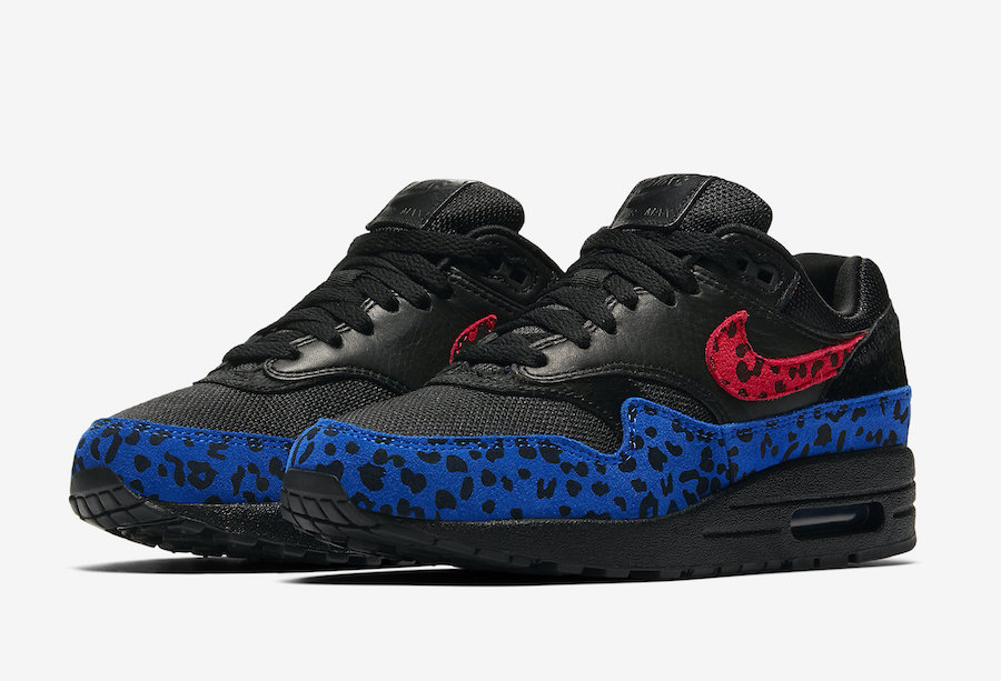 Dressed chiefly in black, this striking version of the Air Max 1 Premium sees the pair decorated with blue leopard print suede running around the mudguard, while similarly, red spotted suede dresses the midfoot Swoosh. One final exclusive touch sees pony-hair decorate the heel for a multi-textured finish.