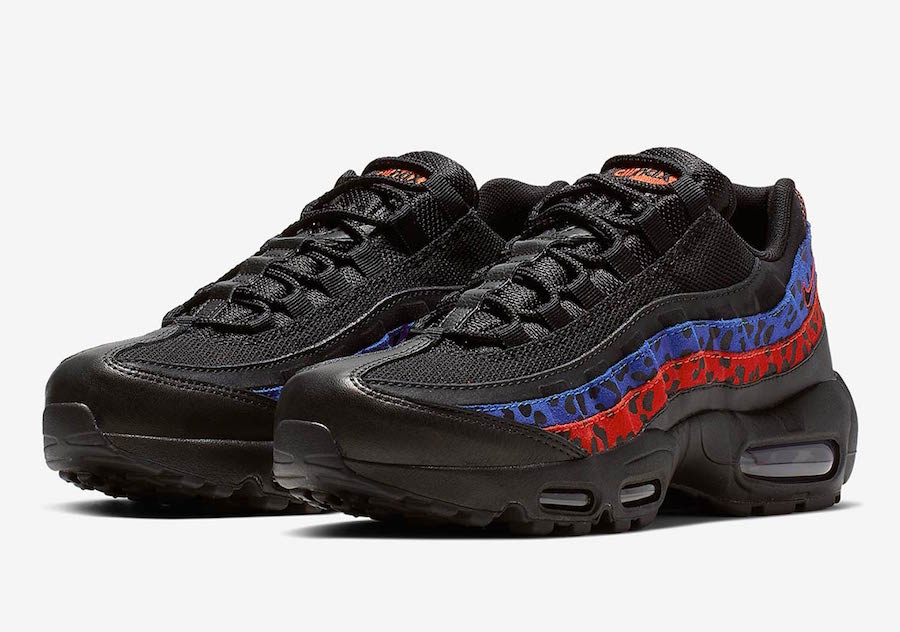Next up, the Air Max 95. The striking iteration is layered in panels of mesh and smooth leather, offset by colourful ‘Habanero Red’ and ‘Racer Blue’ leopard spotted suede to the side panels.