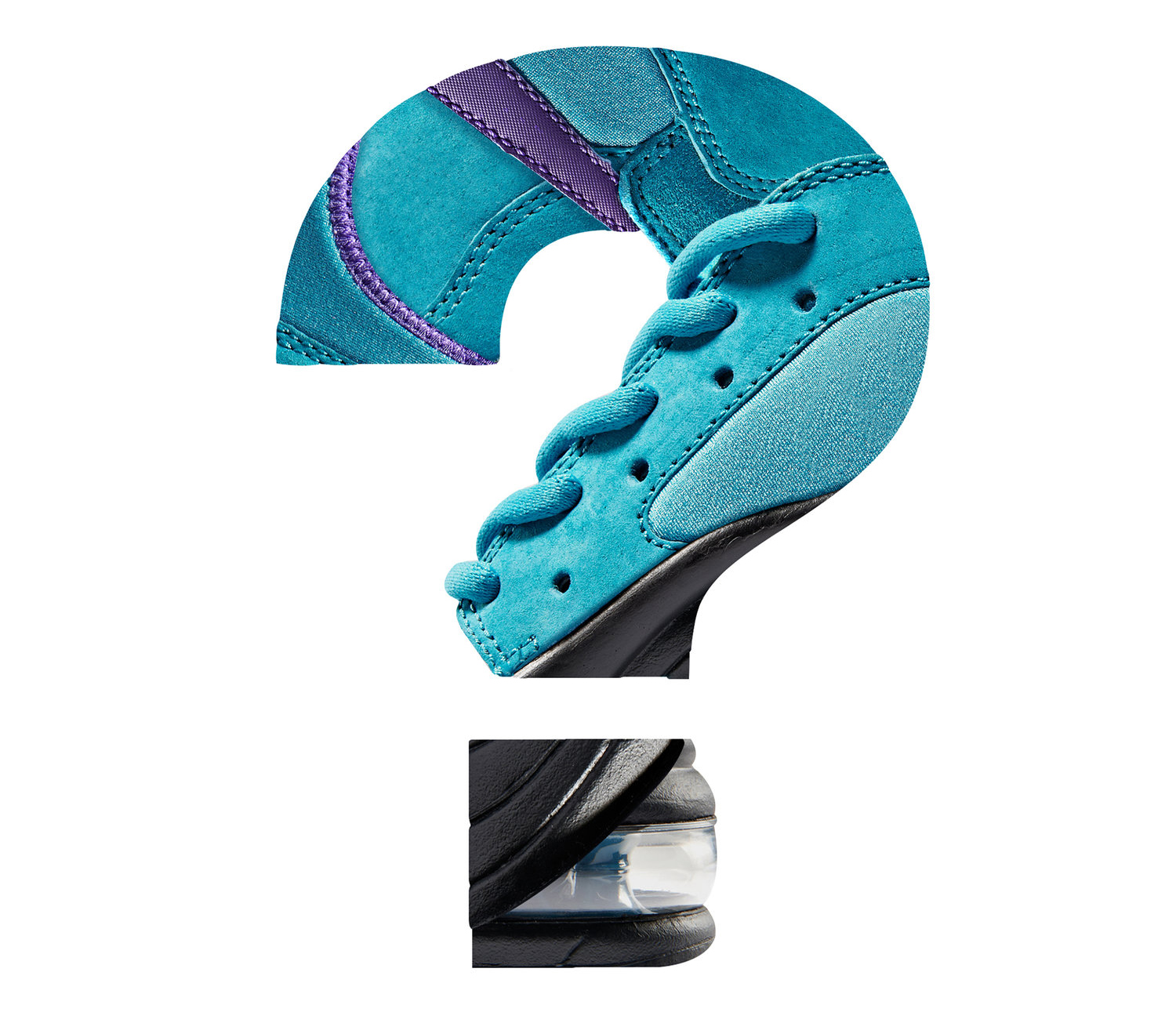 Breathable teal mesh, luxurious suede and debossed leather all worked hand in hand across the model’s vibrant uppers, with dashes of purple to the Swoosh, tongue and heel branding for a touch of contrast.