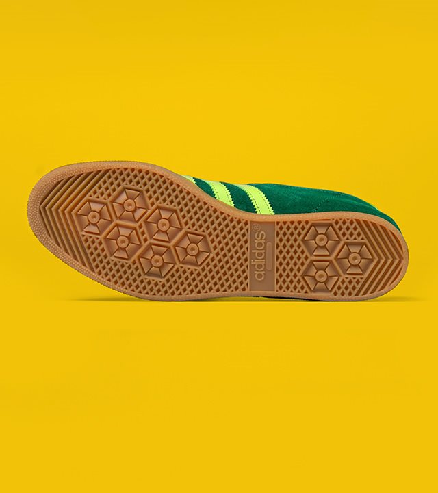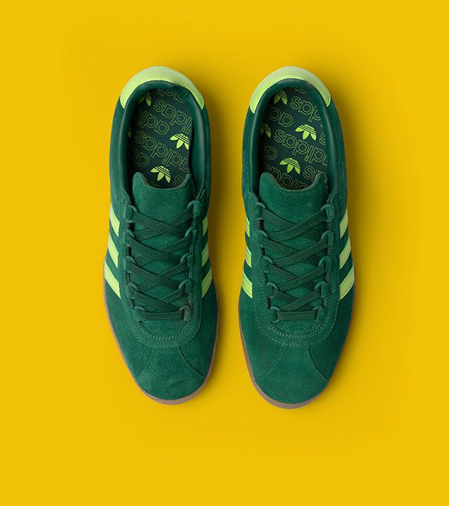 Next in the collection, we are bringing back the beloved adidas Originals London colourway, a true casual classic, sporting inviting hues of green across the uppers. Supple suede forms the top of this trainer, with lime infused serrated 3-Stripes and golden Trimm Star lettering on the lateral sidewall. Tonal laces trickle down the roof of the trainer and a retro gum sole beneath completes its terrace-ready allure.