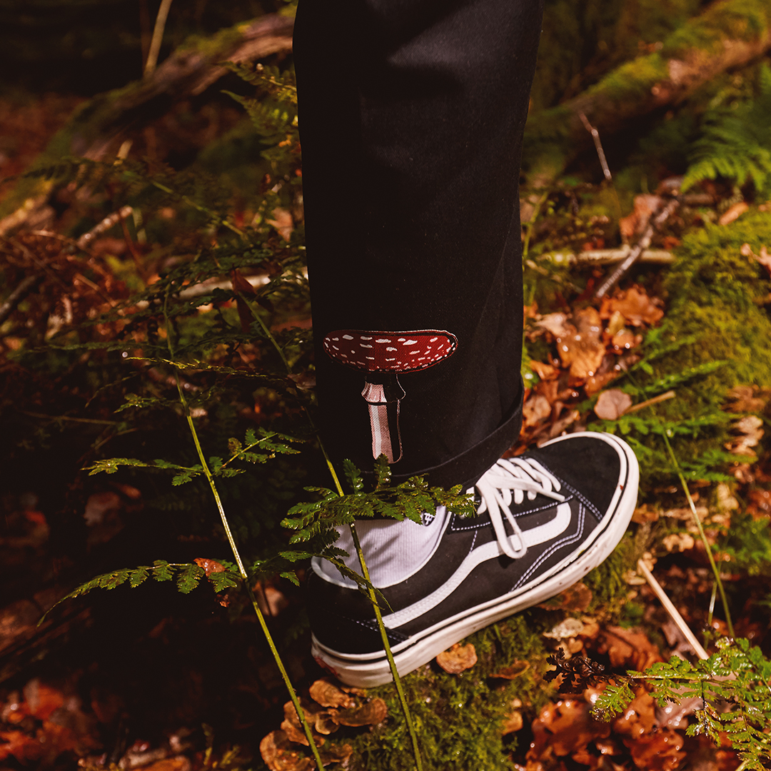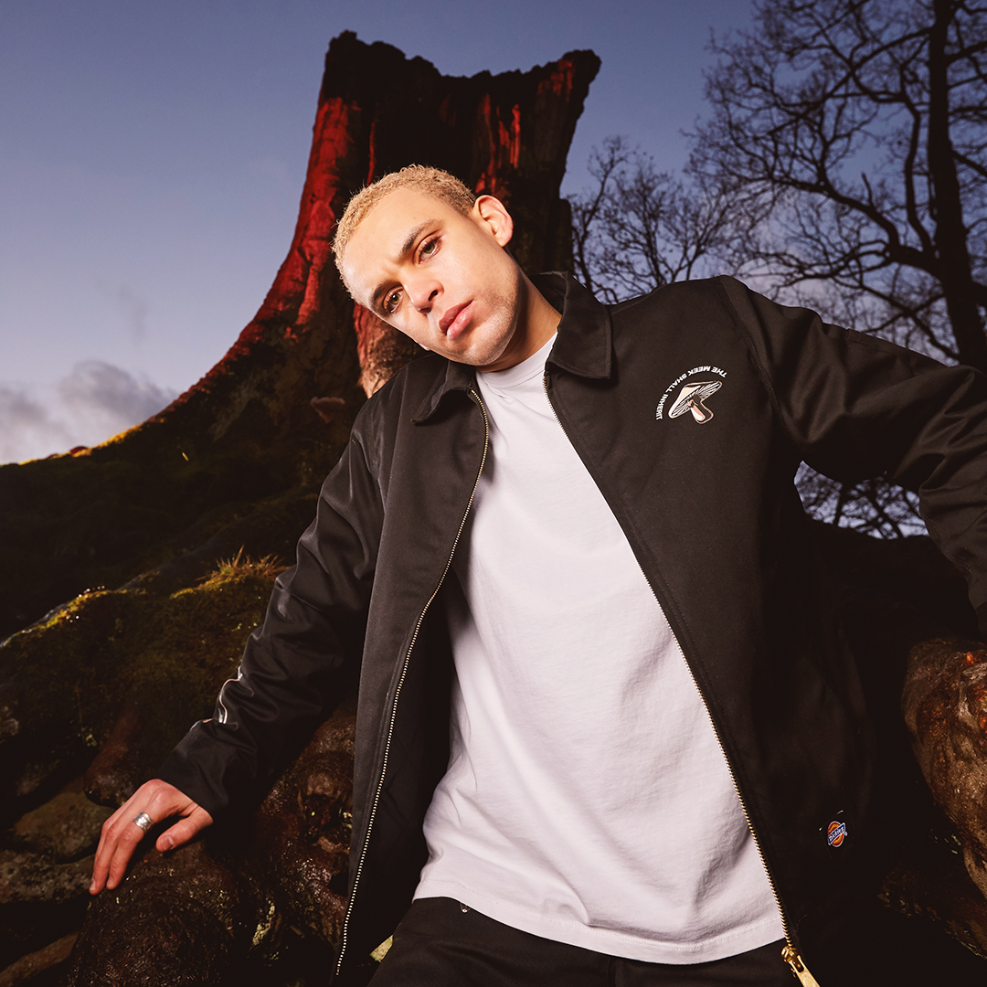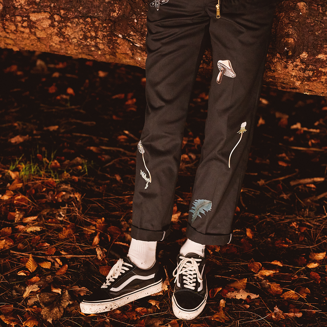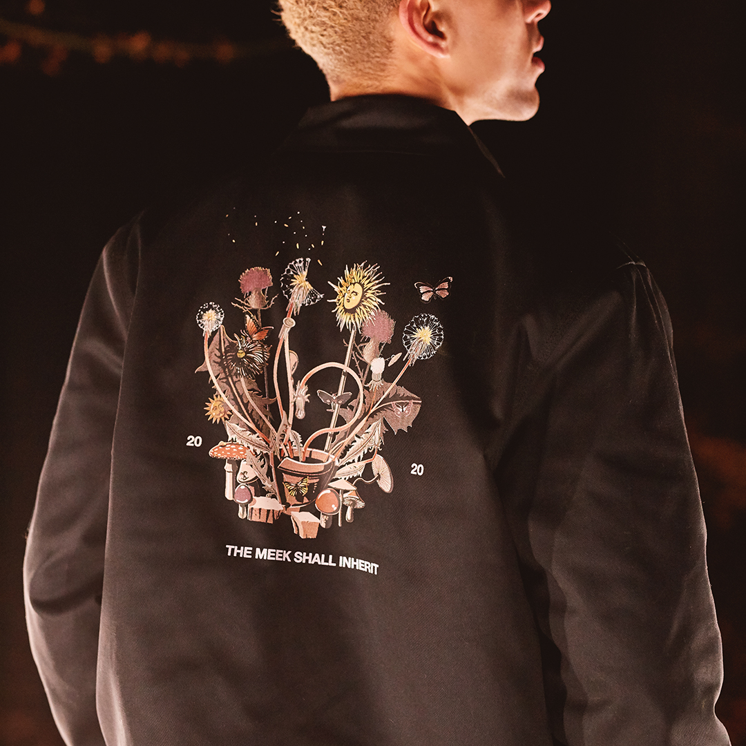 Available in both black or khaki colourways, each piece in the collection comes adorned with floral-inspired graphics. For our exclusive zip-up Dickies jackets, we’ve taken a more simplistic approach on the front; animated mushroom branding is stamped on the chest and ‘The Meek Shall Inherit’ is written just above. The jacket comes into its own on the reverse, with a psychedelic-inspired thematic graphic showing various cartoon-like elements of nature, and a ‘2020’ print to benchmark the celebrations.