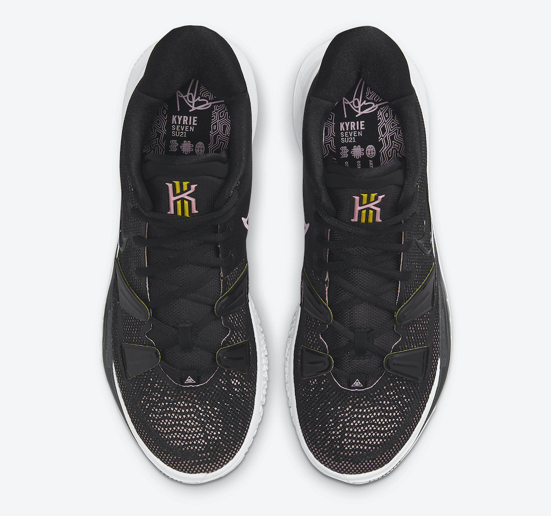 Under the textiles, there is a light pink base that offers a contrast of soft colour underneath the dark netting. Additionally, on the heel, there is a striped design with elegant Kyrie Irving initials. To finish, a white sole unit complements the above and provides supreme cushioning for long days on the courts.