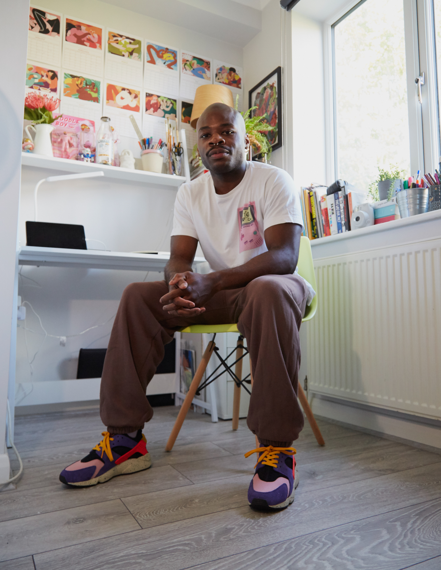 Following Constance Read’s silkscreen triumph, we’re thrilled to present our next creative. Meet Israel Kujore (@israelvisual) an animator and visual artist based in London. Self-described as a ‘nostalgic nerd’, Israel’s style and character-centred craft focuses on his love of anime, manga, games, music and cartoons. Diagnosed with ADHD, Israel is unapologetic in the eclectic nature of his work. Constantly finding new sources of inspiration, his process moves from digital methods to traditional sketchbooks, creating drawings, 3D figures, and animations. The only constants are in trying to stay within the same colour palettes, and ensuring the work is always personal to him.