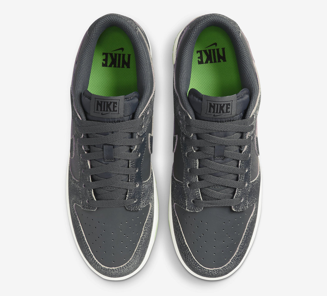 The shoe now gears up for the spookier season, with this Halloween-appropriate makeup. The Nike Dunk Low ‘Iron Grey’ serves up a titular grey shade throughout the upper, with smoother segments overlayed with cracked, textured leather. Dual Swooshes honour Beaverton heritage via the lateral and medial sidewalls, and Nike branding on the heel tab and tongue changes up the usual font, opting for a more jagged style. Perforations in the toe keep things nice and breezy as usual, whilst bright green is used throughout the Nike Grind outsole in keeping with the seasonal get-up.